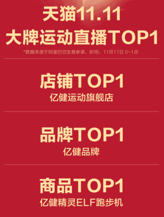 億健和天貓之間的合作非常密切,此前連續4年都是天貓跑步機銷量第一品牌,而今年的雙十一億健繼續發力,在多個統計和排名中名列榜首。除了以上提到的天貓平臺跑步機行業第一之外,億健還在這次電商節拿下了大牌運動直播第一、運動類目店鋪第一(億健運動旗艦店)、運動品牌第一,億健精靈ELF拿到了運動類目商品第一。一口氣拿下了五個行業冠軍,是市場認可度的體現,更是億健品牌實力的完美彰顯!